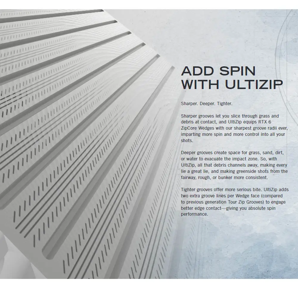 Cleveland Golf RTX 6 Zipcore’s new Hydrazip face blast and laser lines. improved zipcore tech and ultizip groove geometry lets players enjoy supreme greenside spin from the fairway, the rough and even from sand.