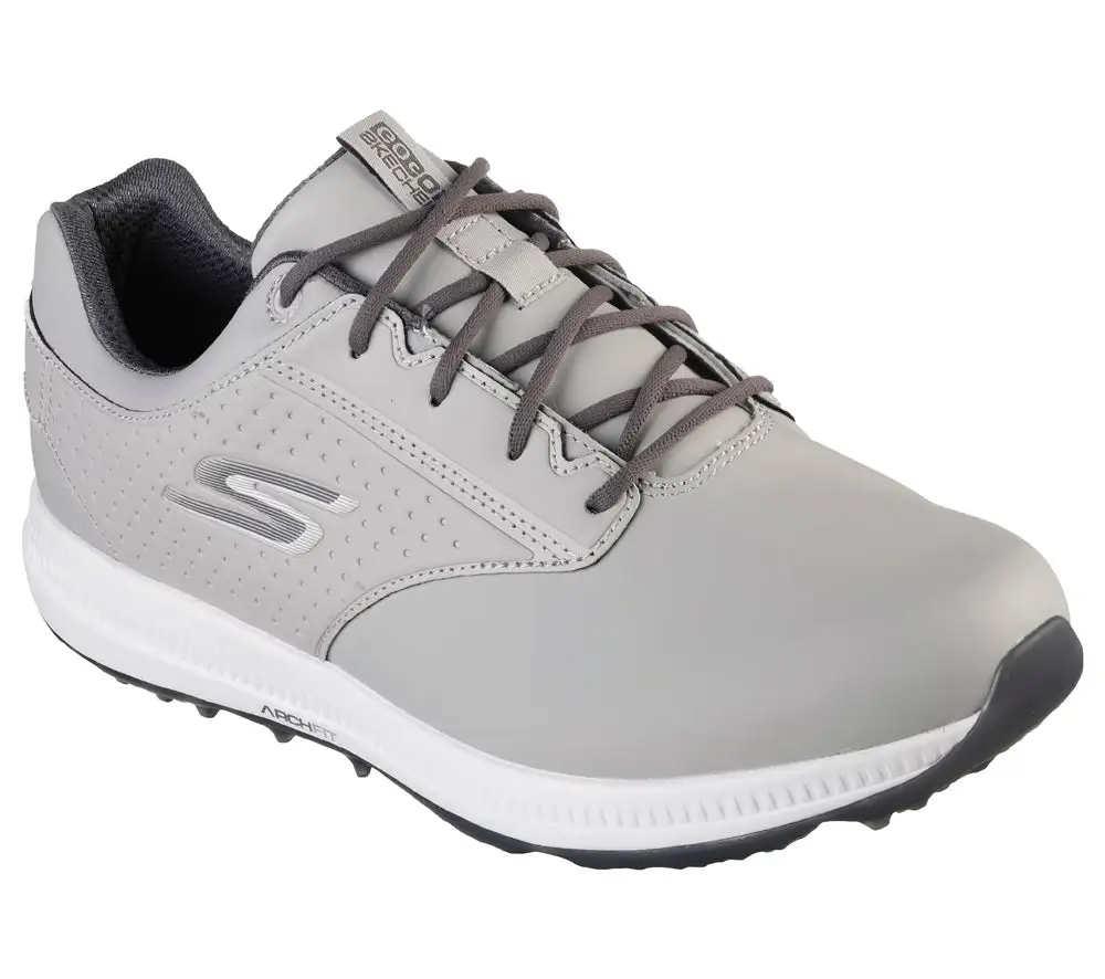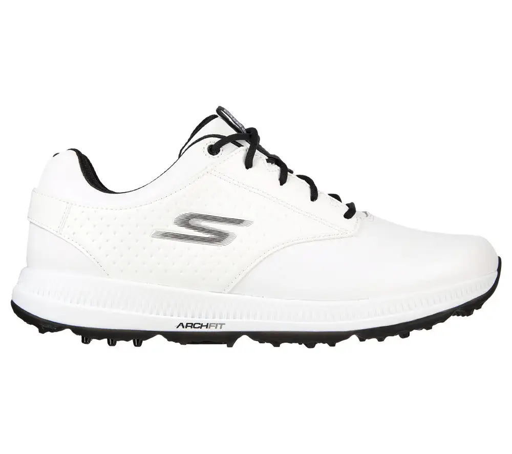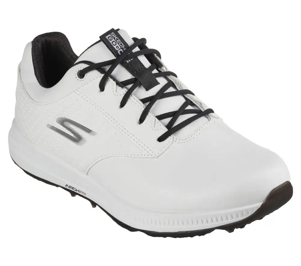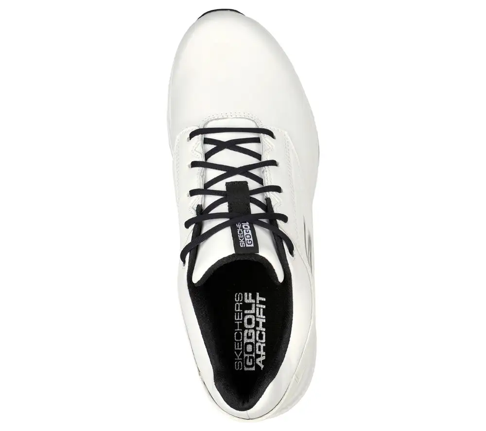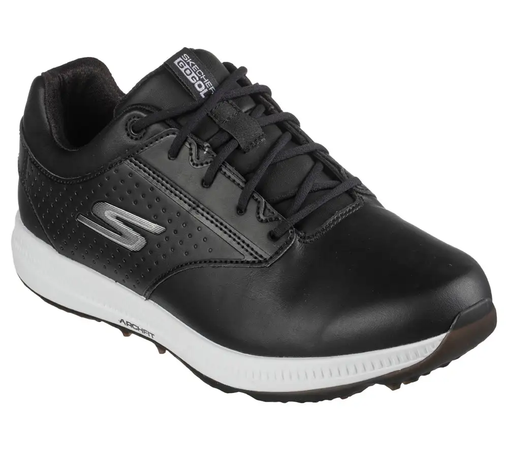 Put on your best game in supportive comfort with Skechers GO GOLF Elite 5 – Legend. This lace-up golf design features a waterproof leather upper with a removable Arch Fit comfort insole and a spikeless traction outsole.